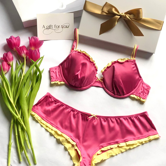 Set de regalo de lencería de satén Glamour: sujetador, short y tanga en una caja de regalo (copa A a F)